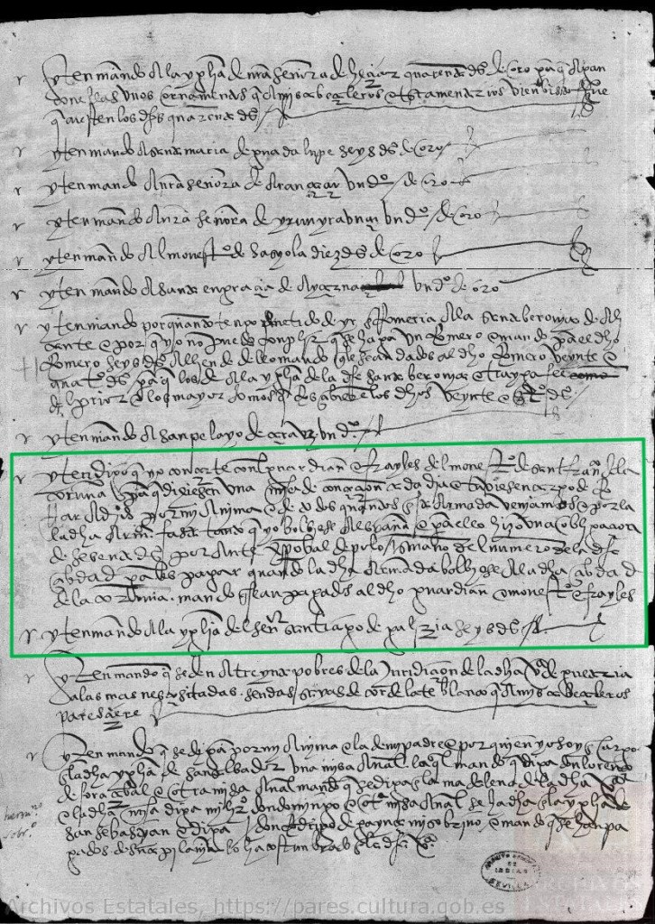 «Item, digo que yo concerté con el guardián é frailes del monasterio de San Francisco de la Coruña para que dijesen una misa de Concepción cada día é tuviesen cargo de rogar á Dios por mi ánima, é de todos cuantos en esta armada veníamos é por la dicha armada fasta tanto que yo volviese á España…»